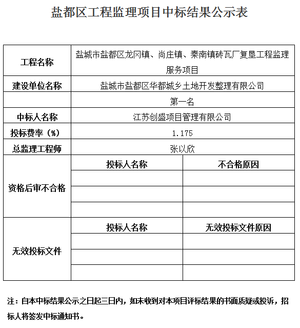 鹽城市鹽都區(qū)龍岡鎮(zhèn)、尚莊鎮(zhèn)、秦南鎮(zhèn)磚瓦廠復(fù)墾工程監(jiān)理服務(wù)項(xiàng)目中標(biāo)結(jié)果公示